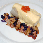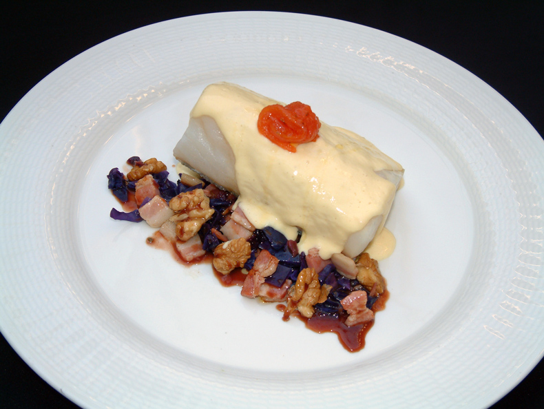 Lomo de Bacalao Plancha con Cristal de Cebolla y Sofrito de Ajetes