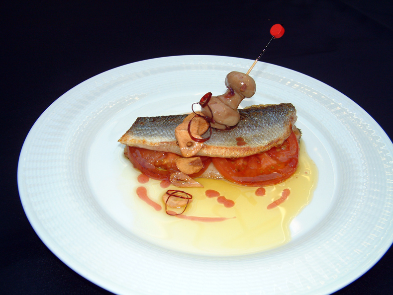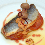 Lubina a la espalda “Amadís”, con brocheta de champiñón, aceite de ajo y emulsión de vinagre de frutos rojos