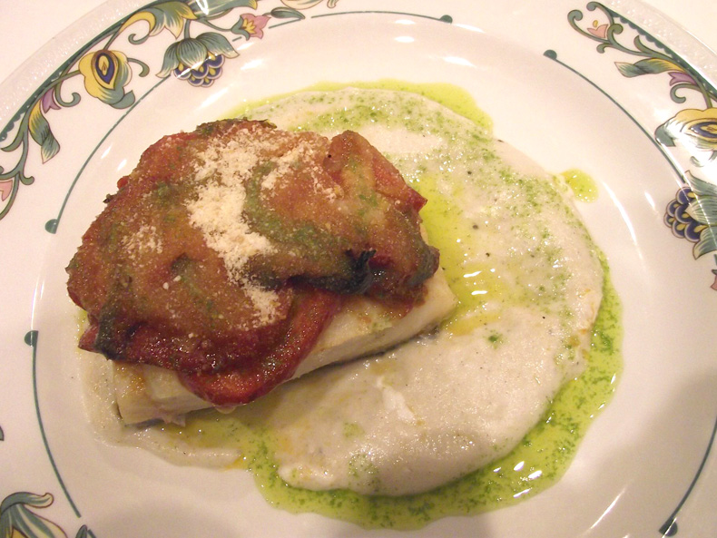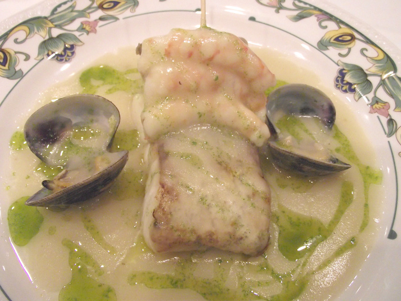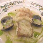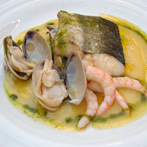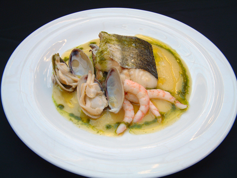 Suprema de Merluza Braseada a la Marinera con Nido de Calamar y Gambas