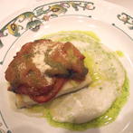 Rollito de lubina relleno de marisco, salsa de cava y crujiente de puerro